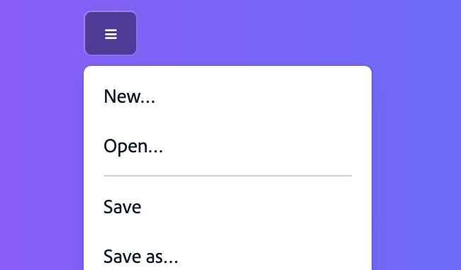 • Trigger interactions – Menus can be triggered by pressing with a mouse or touch, or optionally, with a long press interaction. The arrow keys also open the menu with a keyboard, automatically focusing the first or last item accordingly.
